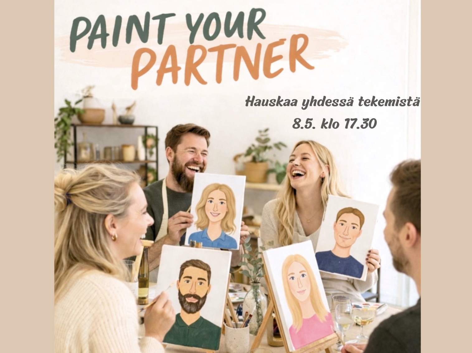 Super hauska ”Paint your partner” -workshop on nyt myynnissä. Tämä työpaja on täydellinen treffi- tai kaveri-ilta, jossa vietätte parituntisen nauraen ja tutustuen toistenne luovaan puoleen. Voit siis ottaa pariksesi puolison, kaverin tai vaikka äitisi. Kerää kaveriporukka kasaan ja tulkaa yhdessä!